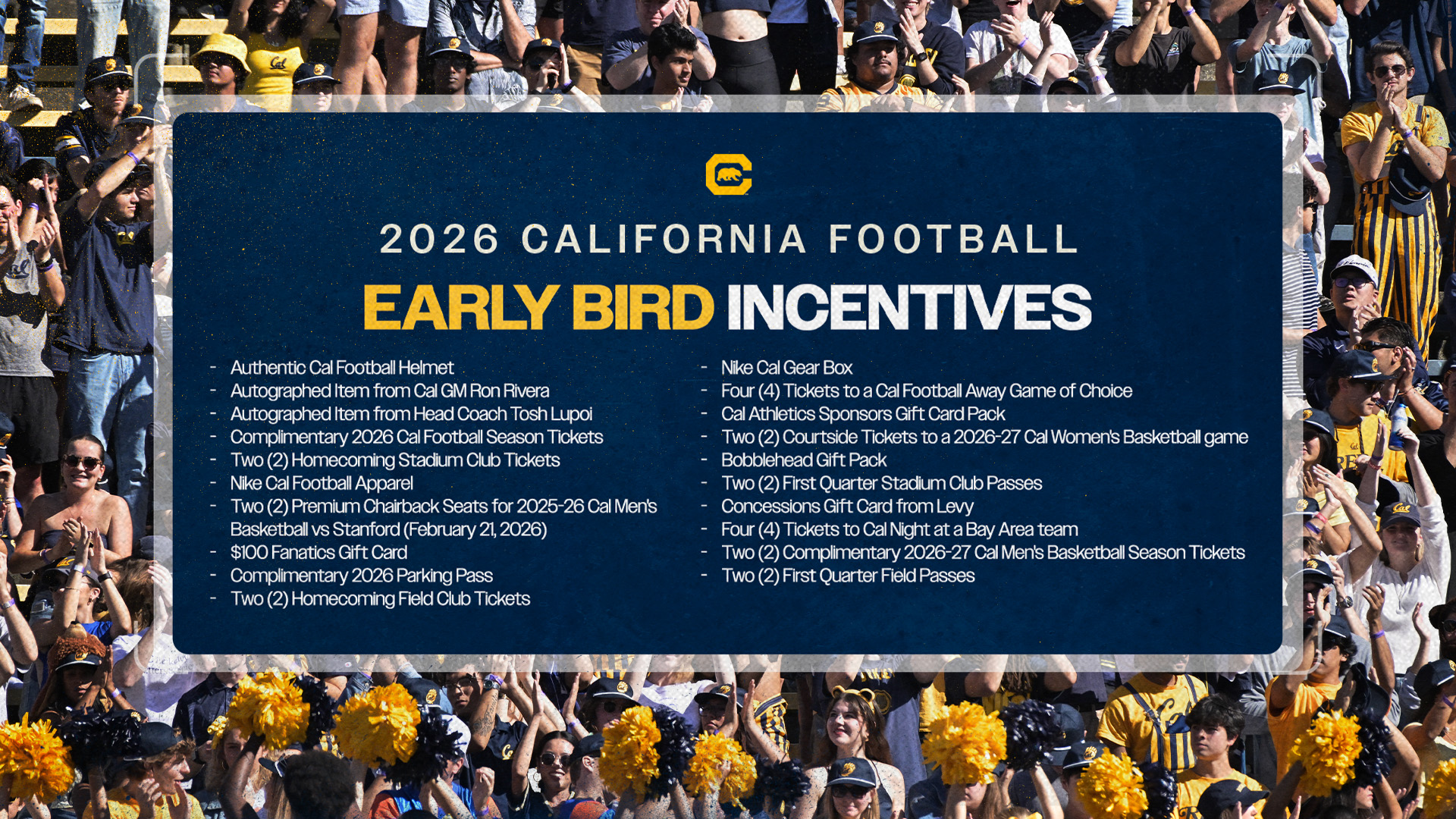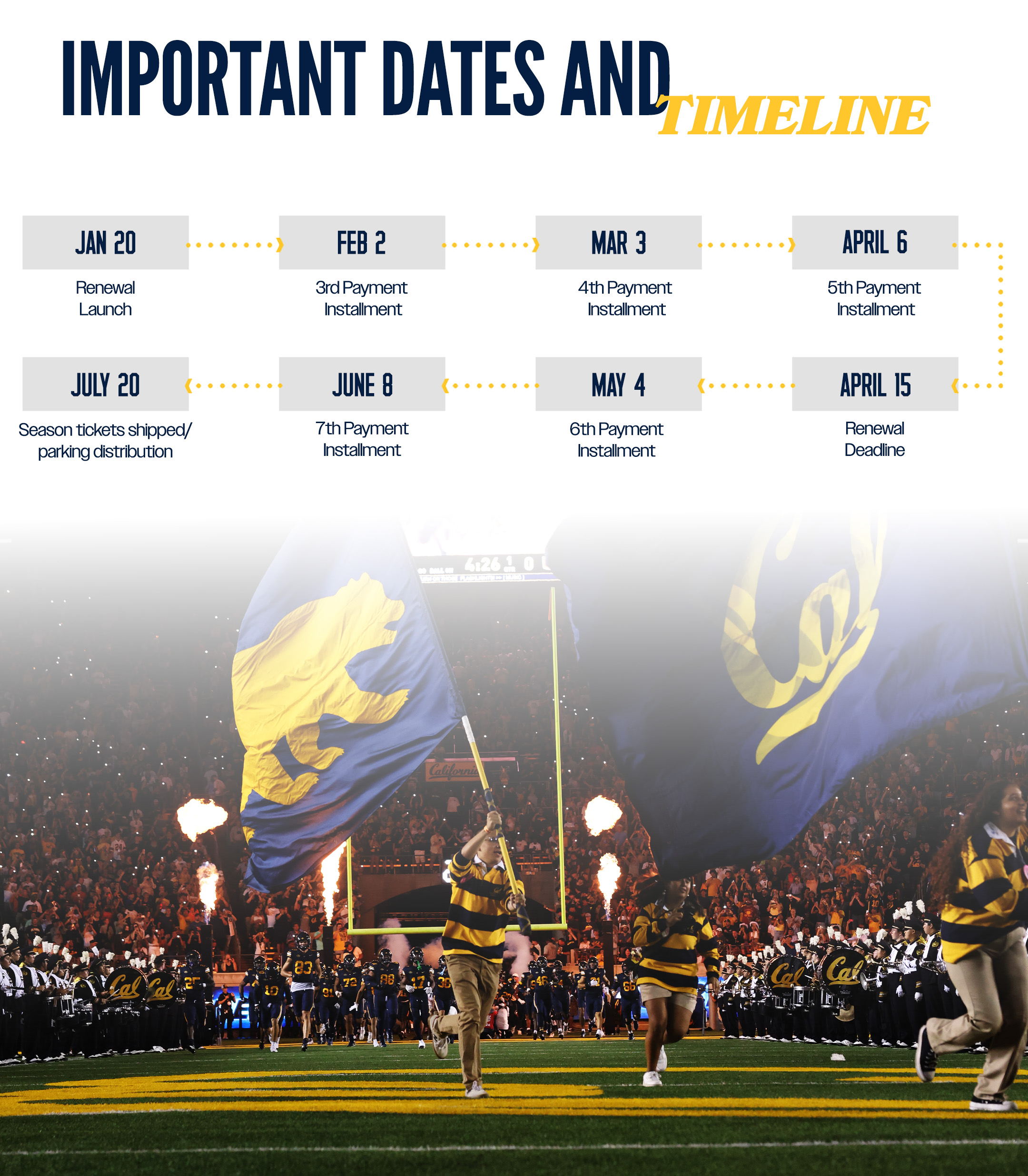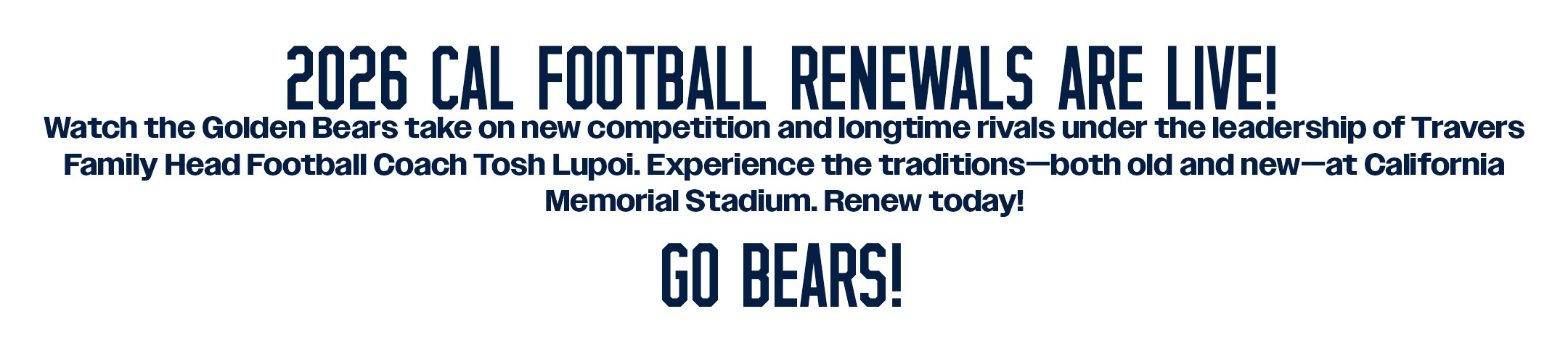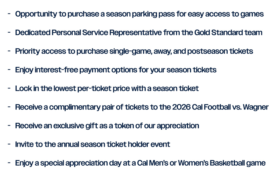 To renew your season tickets for the 2026 Cal Football season, log into your account and click on "Season Renewals" in the top menu bar. Then, select 2026 Football Season Renewal - New Application to access your renewal form. If you need any assistance renewing your 2026 Cal Football season tickets, please contact your Gold Standard representative at goldstandard@berkeley.edu or 1 (800) GO-BEARS, ext 1.